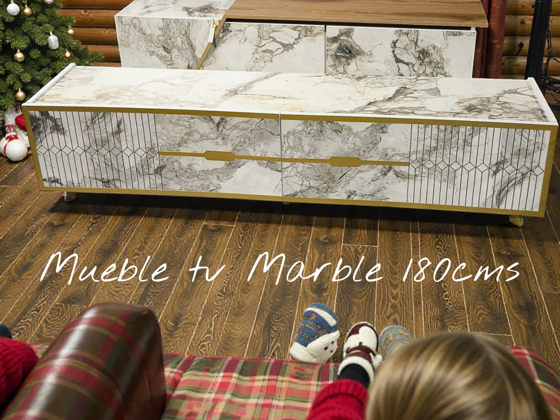 -Acabado bilaminado de color blanco con 4 puertas frontales en mármol blanco con detalles en tonos dorados